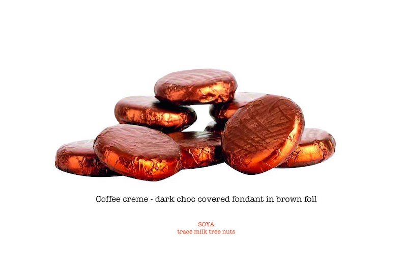 Dark chocolate covered coffee fondant in brown foil.