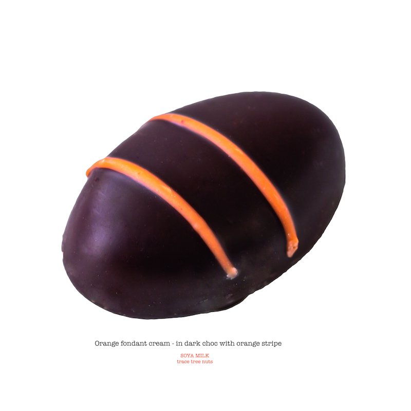 Orange fondant cream in dark chocolate with an orange stripe.