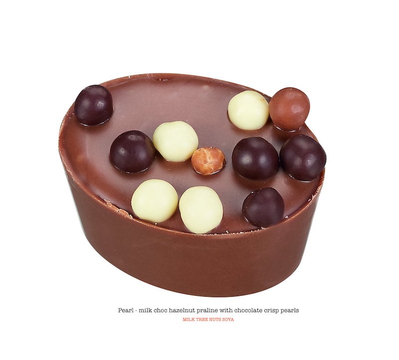 Milk chocolate hazelnut praline with chocolate crisp pearls.