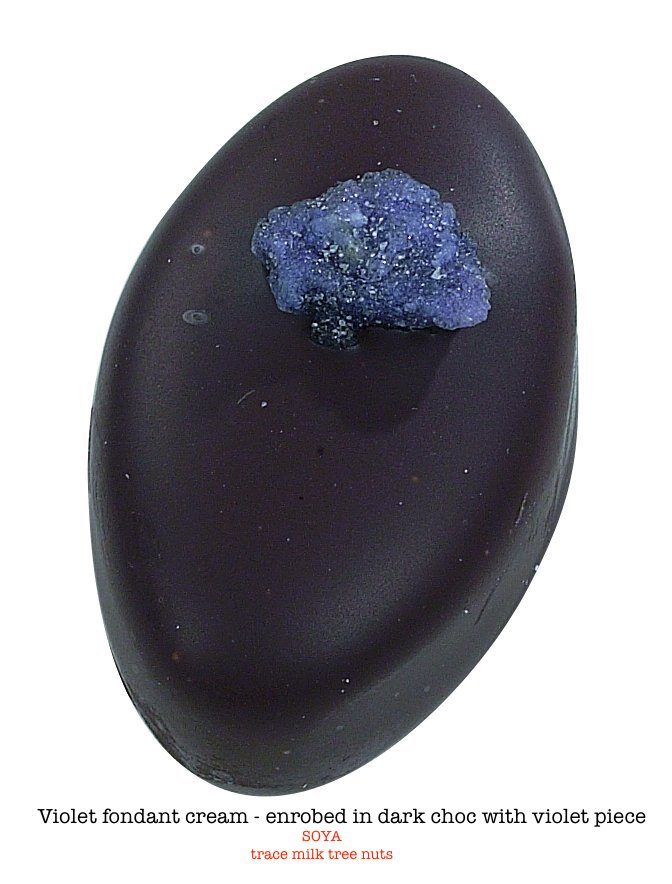 Violet Fondant Cream – enrobed in dark chocolate with violet piece.